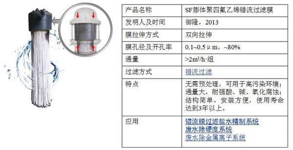 l 膨体聚四氯乙烯(ePTFE)膜聚四氟乙烯经过拉伸膨化形成,孔径为0.1~1微米的致密小孔,制成滤膜其过滤方法与众不同,它是以薄膜滤料达到真正的表面过滤效果,其好处是:使液体中的悬浮物被全部截留在薄膜的表面,由于薄膜具有极佳的不粘性和非常小的摩擦系数,因而薄膜滤料不易产生堵塞的现象。这样在不增加运行负荷的情况下既保证了液体的最大通量,同时也有效地收集了液体中的固体颗粒。 质密、多孔、光滑的聚四氟乙烯(PTFE)薄膜使固体颗粒的穿透接近零,它的低摩擦系数、化学稳定性和表面光滑的特点使过滤压力仅需0.05~0.1MPa,并且薄膜的表面极为容易清理。它以极为短暂以秒计算的清膜时间,使过滤过程基本达到连续运行,同时聚四氟乙烯又是一种强度很高的材料,使滤料寿命大大高于常规滤料。 l 表面过滤原理ePTFE膜表面过滤 传统深度过滤滤料孔径大,起始阶段污泥穿透入滤料面部,此时过滤液中SS过高,当过滤一段时间后,滤料表面积累了滤饼起到了助滤的作用,过滤液SS可达标,但此时过滤压力升高,通量下降;滤液反冲可去除部分滤料表面滤饼,但无法将进入滤料中的杂质去除,再次过滤时滤料无法恢复最佳状态。 表面过滤过滤时污泥被阻隔在滤膜表面,过滤一段时间后过滤器自动反清洗数秒钟又进入过滤状态,污泥被完全推离膜表面,滤膜恢复初始状态,且自始至终污泥没有穿透入膜内部,滤清液保持最佳品质。 l 双向拉伸ePTFE膜SF膜为双向旋转拉伸四氟管式膜,无缝管式结构。膜开孔率较单向拉伸膜更大,强度更高,经测试单丝断裂强度超过50磅。制造时膜孔径可根据要求在0.1~0.5微米范围内调节。开孔率达到80%。膜表面孔径为0.2微米,保证出水指标达到用户要求。一次浇铸成型,不需要后续密封紧固,避免了长久使用后可能产生的泄漏问题。特殊的组件结构保证了膜可在各种恶劣环境中稳定使用。安装方便,可置换性强。